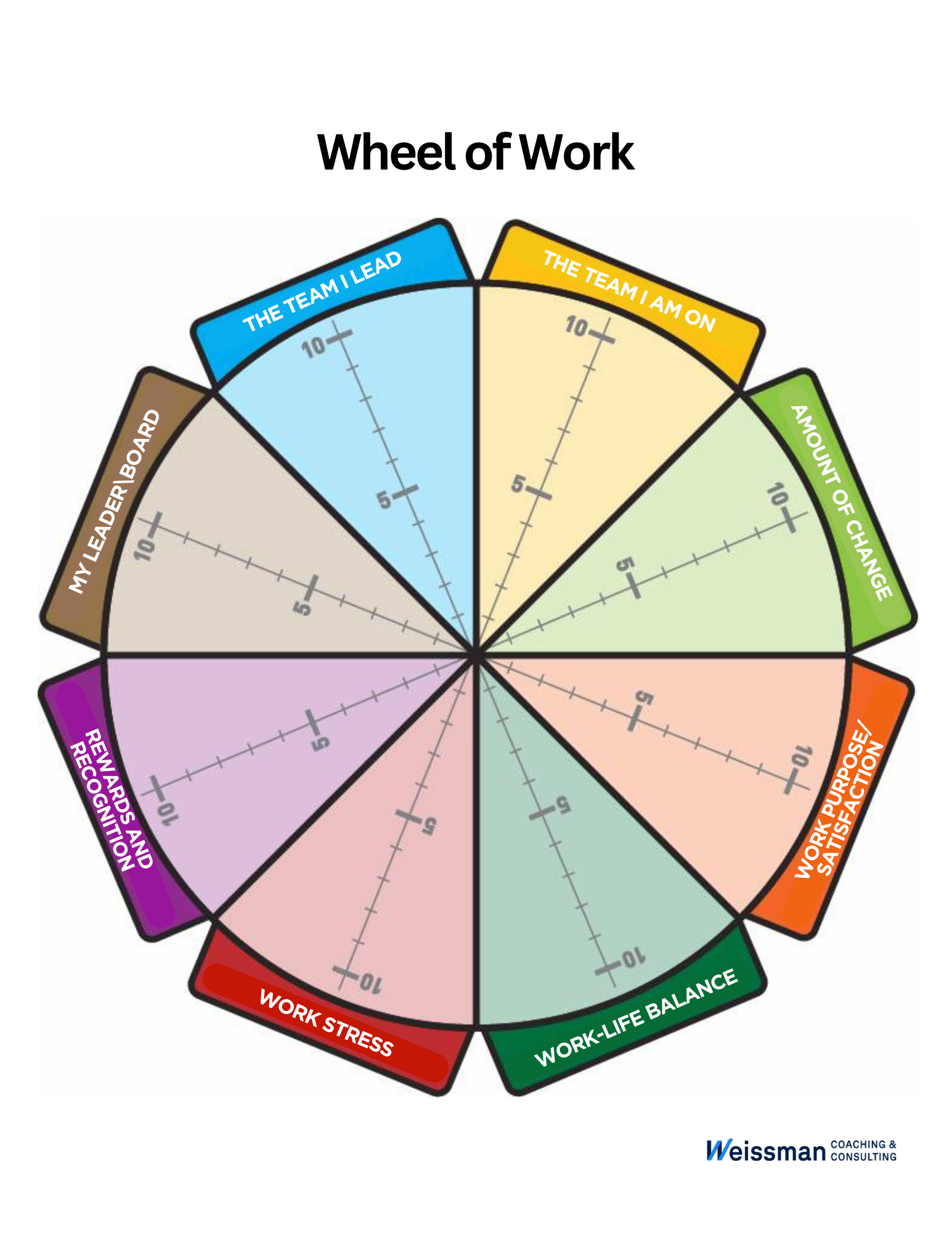 The next step is easy: fill in each “pie segment” with your satisfaction rankings for each category. When this is done, you will have a wheel that illustrates how much “balance” you currently have as well as the areas of most resonance and dissonance. A Wheel of Work might look like this: